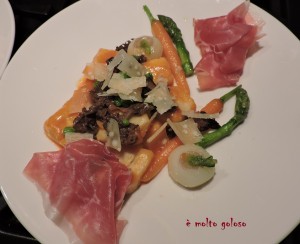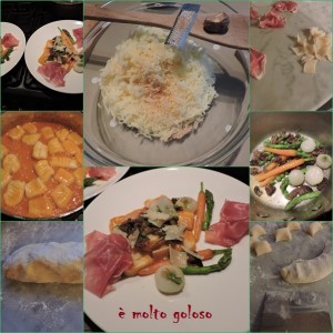 ◊ Dresser sur assiettes chaudes : gnocchi sauce tomate, légumes primavera. Finir jambon cru et parmesan.