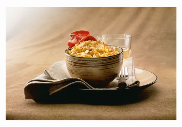 ◊ Gratiner à four chaud +170°C. Finir avec une tranche de jambon en rosace par convive.