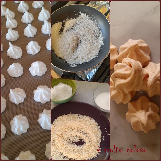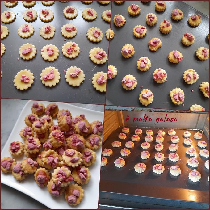 - Poser les ronds sur une plaque. » Dorer » avec du café et parsemer de pralines roses concassées.