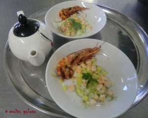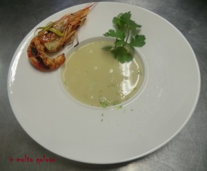 ◊ Dresser en assiettes creuses chaudes : mangue, salpicon de crevettes, citronnelle, gingembre, zeste de citron vert. ajouter la soupe au lait de coco très chaude. Finir gamba grillée et pluches de coriandre fraîche et râpée de citron vert au départ.