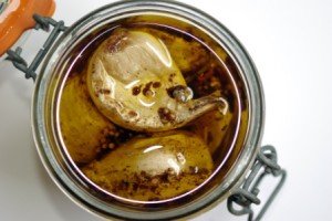 • Faire chauffer l’huile avec tous les aromates dans une casserole. Lorsqu’elle frissonne, baisser le feu et immerger l’ail.