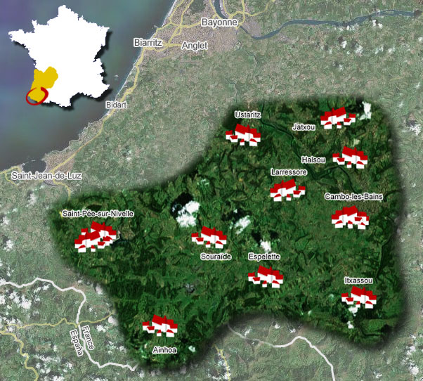 L’aire de production regroupe 10 communes : Ainhoa – Cambo-les-Bains – Espelette – Halson – Itxassou – Jatxou – Larressore – Saint-Pée-sur-Nivelle et Ustaritz.